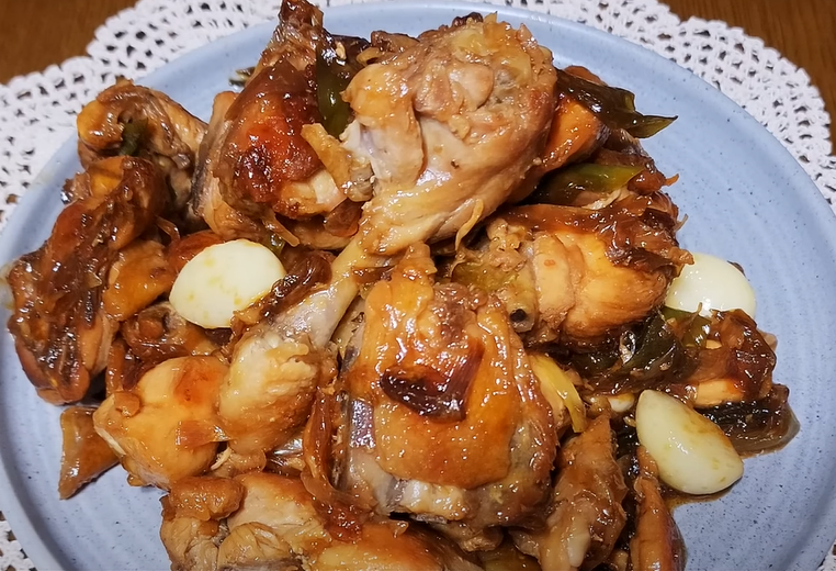 6. 닭과 채소를 한쪽으로 몰고, 빈 공간에 간장 3T를 넣어 살짝 태우듯이 끓이고 섞어준다.